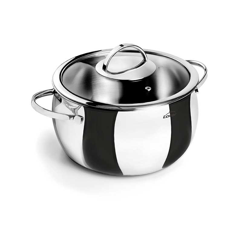 Panela com tampa modelo Belly fabricada em aço inoxidável 18/10 com fundo termodifusor sanduíche adequado para placas de indução, elétricos, placas e fogões a gás.