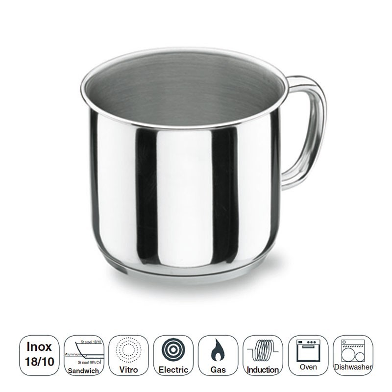 Pote cilíndrico fabricado em aço inoxidável 18/10 de alta qualidade que oferece excelente resistência à corrosão e aos ácidos alimentares e sais.