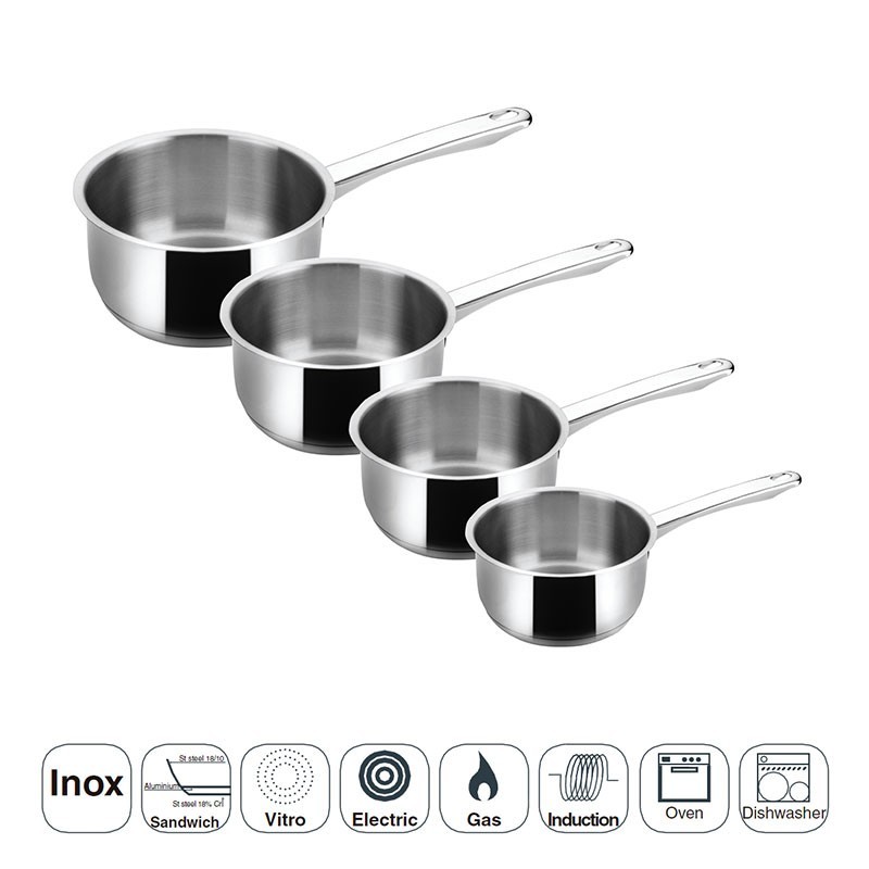 Lote de 4 colheres modelo Basic é fabricado em aço inoxidável com fundo termodifusor sanduíche adequado para placas de indução, elétricos, placas e fogões a gás.