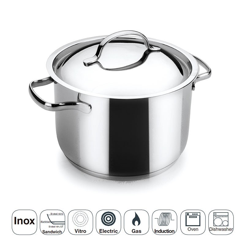 Panela com tampa modelo Basic fabricada em aço inoxidável com fundo termodifusor sanduíche adequado para placas de indução, elétricos, placas e fogões a gás.