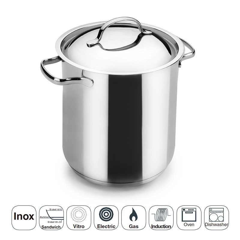 Panela super alta modelo Basic fabricada em aço inoxidável com fundo termodifusor sanduíche adequado para placas de indução, elétricos, placas e fogões a gás.