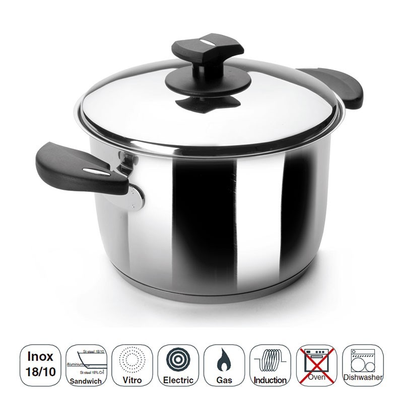 Panela fabricada em aço inoxidável 18/10 de alta qualidade que oferece excelente resistência à corrosão e aos ácidos alimentares e sais.