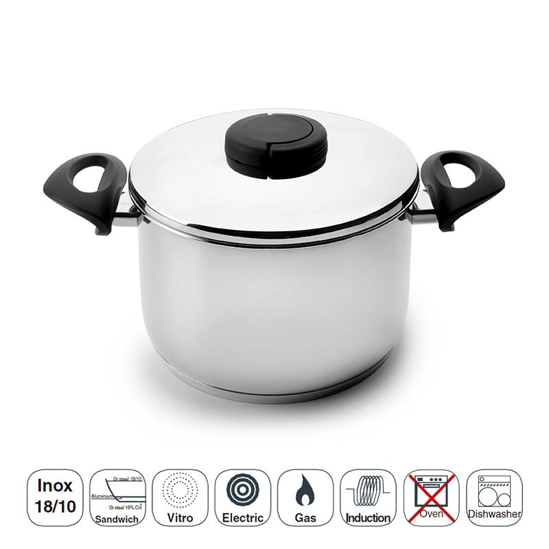 Panela fabricada em aço inoxidável 18/10 de alta qualidade que oferece excelente resistência à corrosão e aos ácidos alimentares e sais.