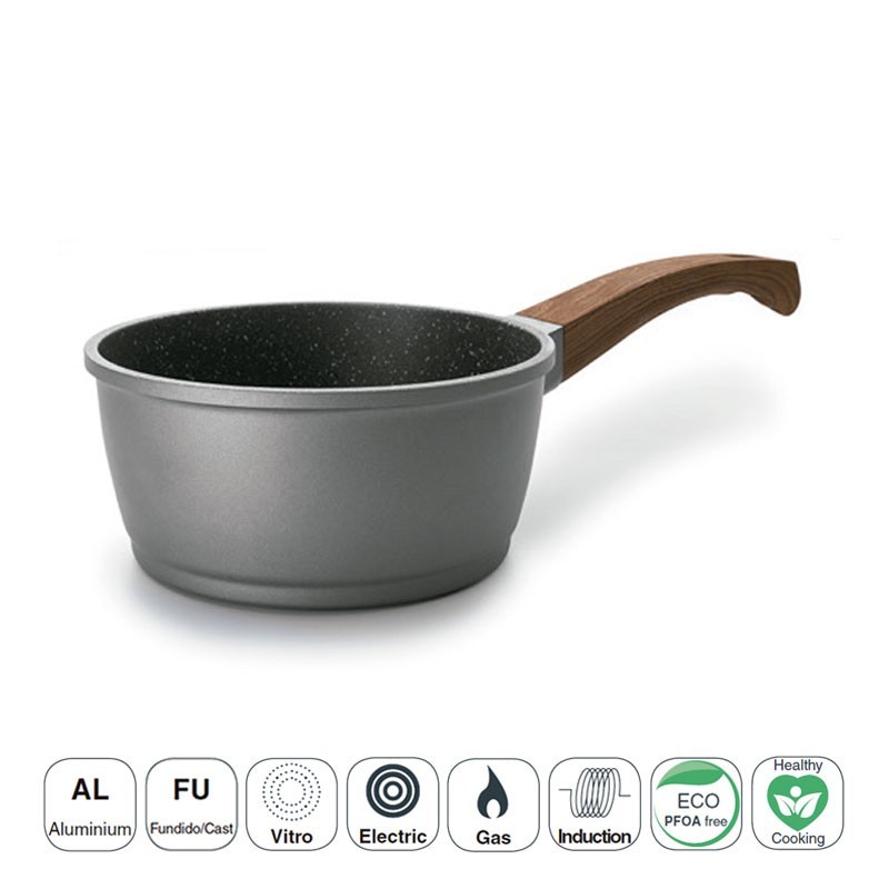As peças desta linha estão equipadas com um revestimento anti-aderente de alta qualidade, ecológico, livre de PFOA, e são reforçadas com acabamento em pedra.