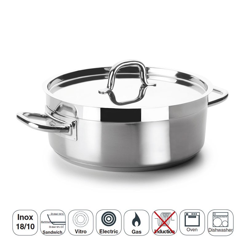 Bandeja profissional com tampa modelo Chef Luxe fabricada em aço inoxidável 18/10 com fundo termodifusor sanduíche adequado para placas de indução, elétricos, placas e fogões a gás.