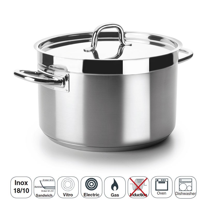 Bandeja profissional alta com tampa modelo Chef Luxe fabricada em aço inoxidável 18/10 com fundo termodifusor sanduíche adequado para placas de indução, elétricos, placas e fogões a gás.