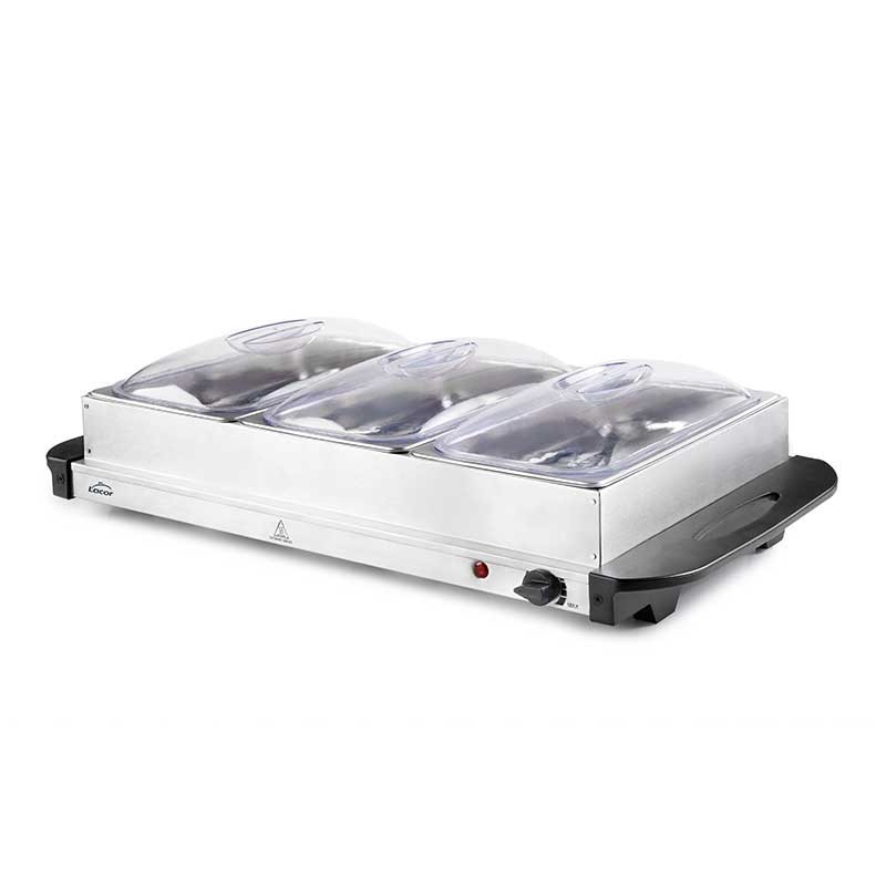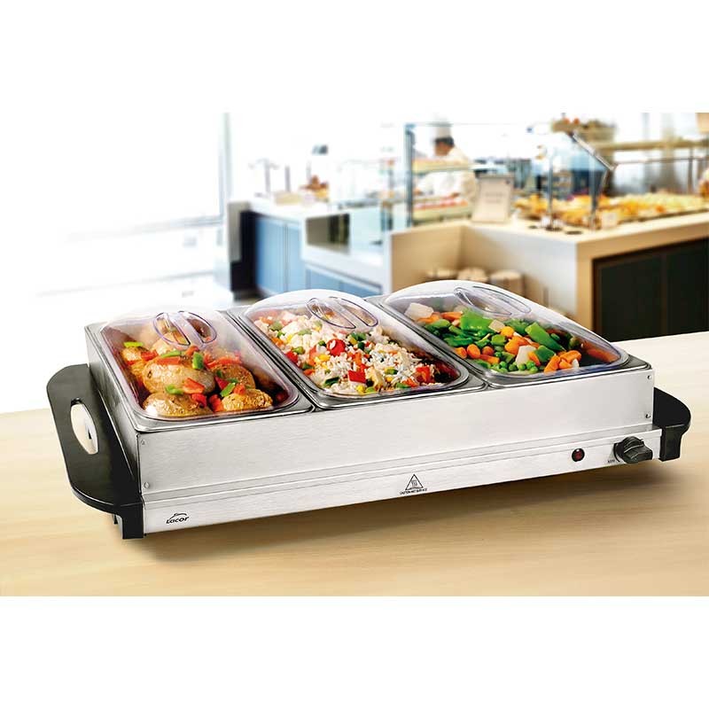 Placa de aquecimento elétrico de aço inoxidável 18/10 de alta qualidade com 3 cubas GN 1/3 com tampas transparentes. Ideal para hotelaria, bufês, catering, etc.