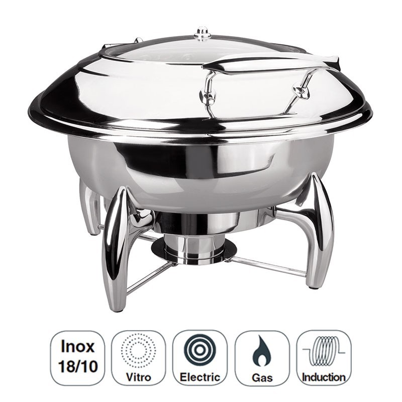 Chafing Dish redondo gama Luxe fabricado em aço inoxidável 18/10 de alta qualidade e excelente resistência à corrosão. Ideal para hotelaria e buffets.