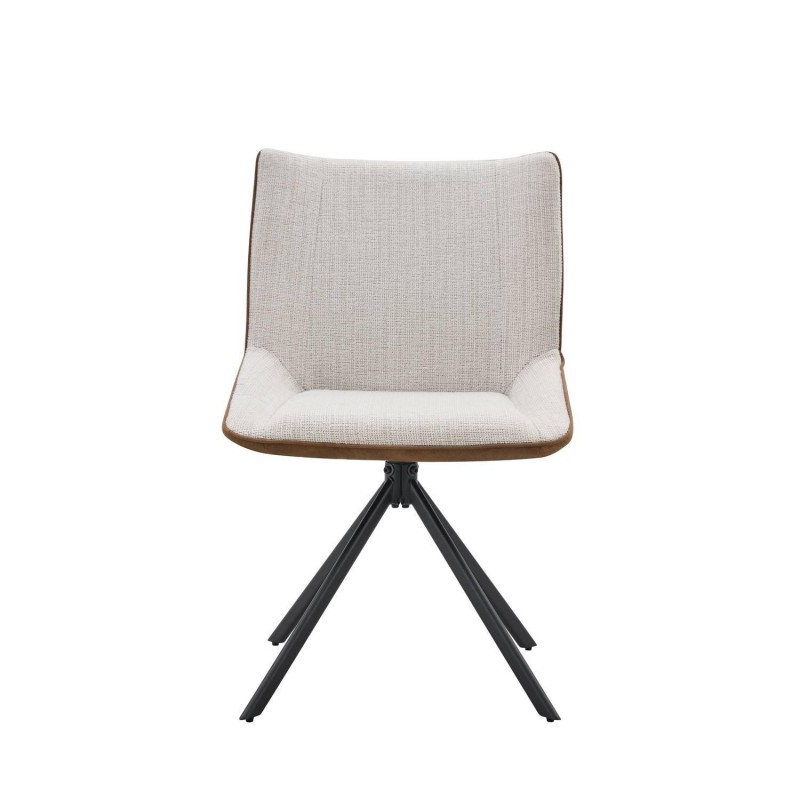 A cadeira ALESSIA combina seu assento e encosto estofados em um tecido texturizado bege com uma camada externa que simula camurça, proporcionando uma textura suave e agradável ao toque.