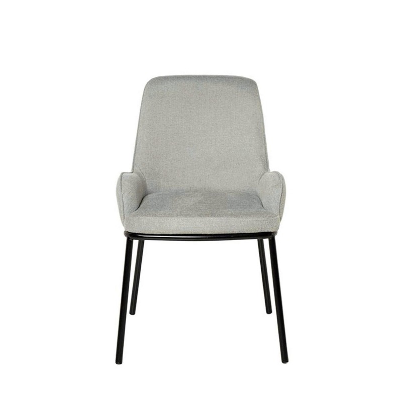 Cadeira LARISA: design inovador com encosto e apoios de braço integrados. Tecido cinza claro acolchoado e detalhes metálicos pretos. Conforto e estilo moderno.