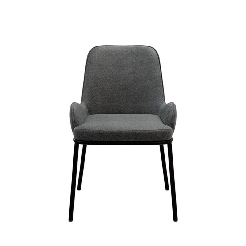 As tampas metálicas pretas criam um contraste elegante com o tom cinza do tecido, tornando a cadeira LARISA uma opção perfeita para aqueles que buscam uma combinação de minimalismo e conforto em seu mobiliário.