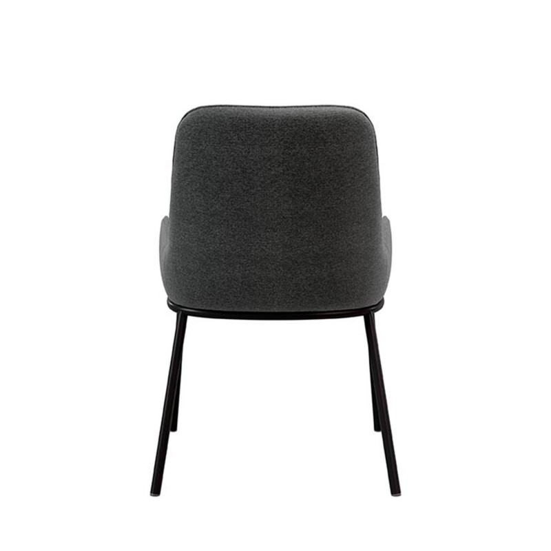 Cadeira LARISA: design inovador com encosto e apoios de braço integrados. Tecido cinza escuro acolchoado e detalhes metálicos pretos. Conforto e estilo moderno.