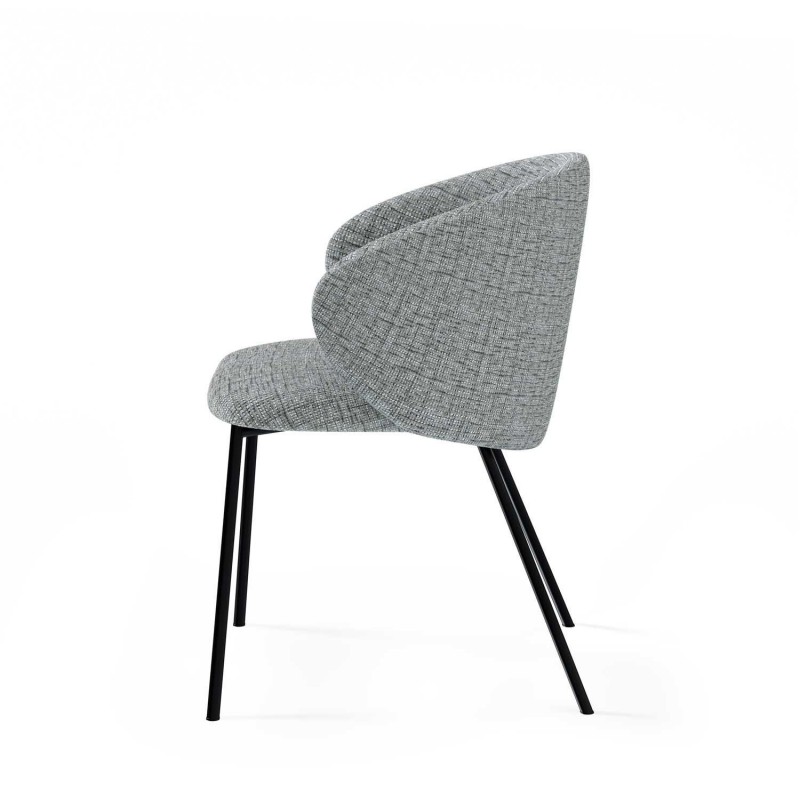 Cadeira MERIDA: design vintage em tecido cinza, estrutura envolvente e acolchoada para máximo conforto. Pés metálicos pretos. Elegância e estilo moderno.