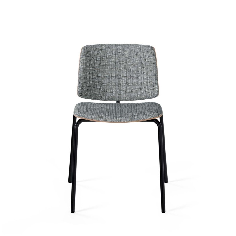 A cadeira ROMINA apresenta um design moderno e minimalista, destacando-se pelas suas pernas metálicas em preto que contrastam elegantemente com o assento e o encosto estofados em cinza, fabricados em 100% poliéster.