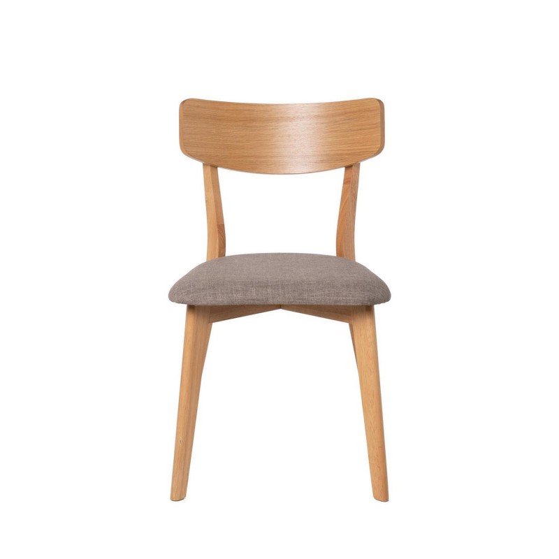 Sua estrutura é feita de chapa natural de carvalho, o que lhe confere um aspecto elegante e atual. O assento, estofado em tecido cinza claro (100% poliéster), adiciona um contraste sofisticado e contemporâneo.