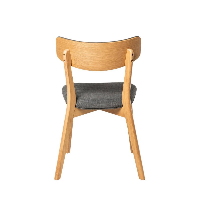 A cadeira de madeira ANAIS é fabricada em chapa natural de carvalho e estofada em tecido de cor cinza escuro (100% poliéster) no encosto e no assento.