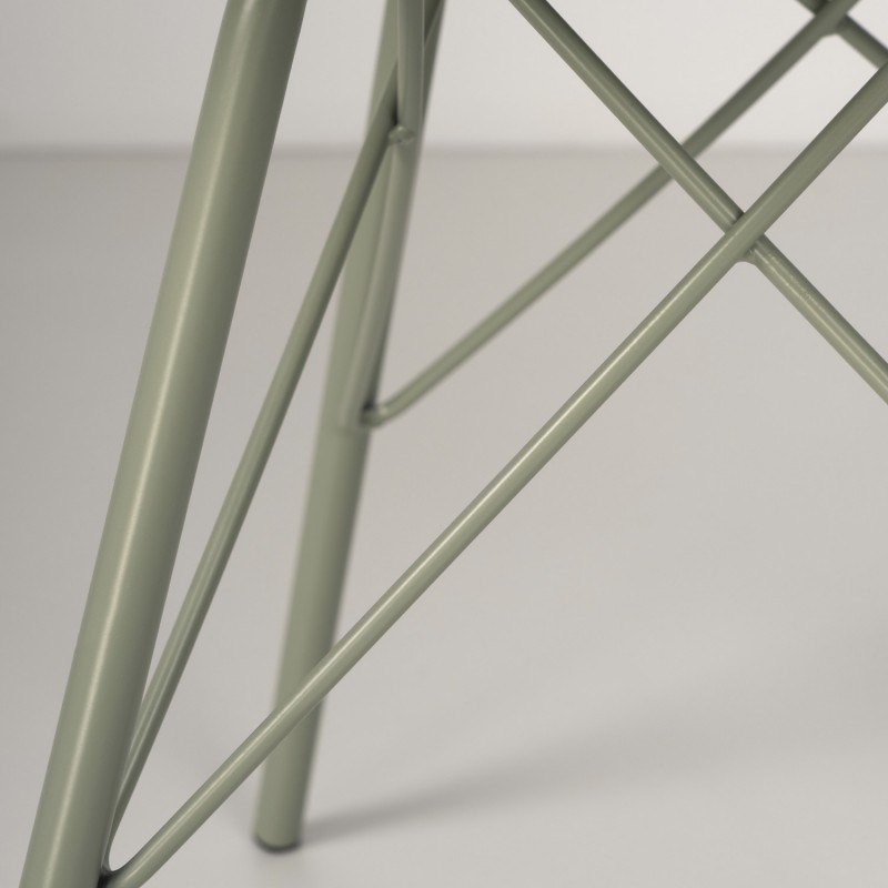 As pernas de metal, com uma estrutura entrecruzada, não só adicionam estabilidade, mas também realçam o design minimalista da cadeira.