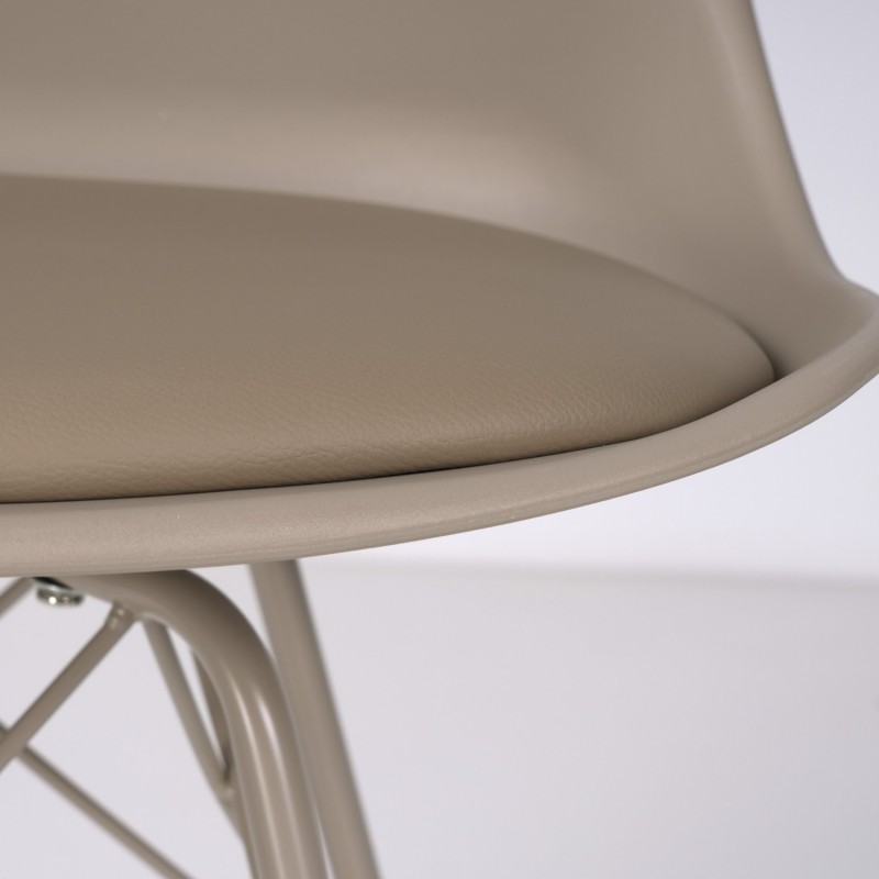O encosto, feito de polipropileno com uma leve curvatura ergonômica, é projetado para favorecer uma postura confortável e natural. O assento, acolchoado com poliuretano, proporciona um conforto extra, tornando-o perfeito para uso prolongado. As pernas de metal, com uma estrutura entrelaçada, não só adicionam estabilidade, mas também realçam o design minimalista da cadeira.