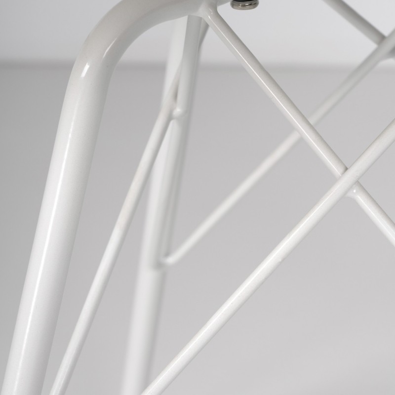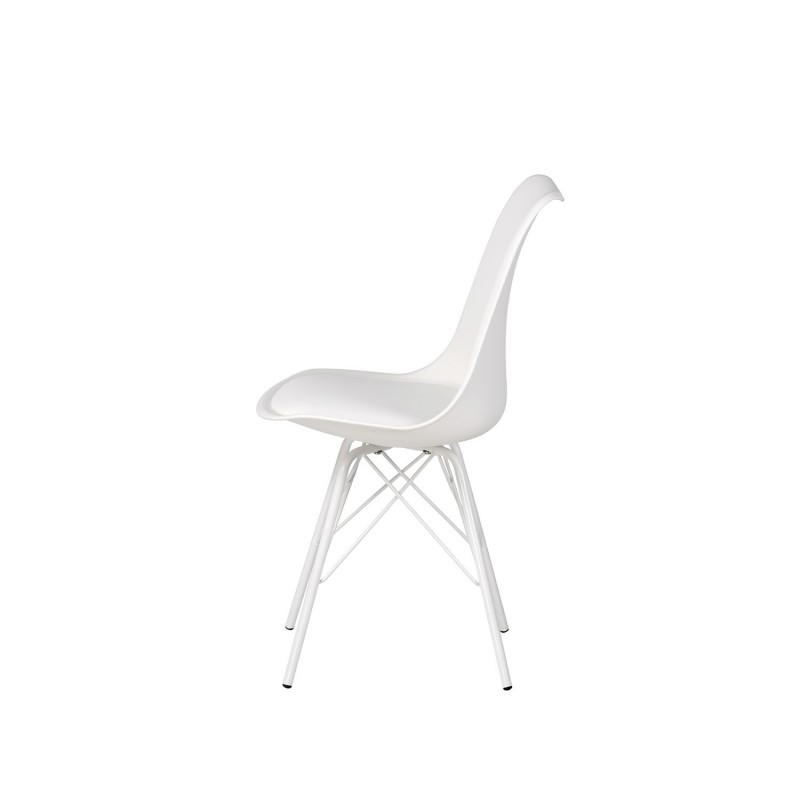 O encosto, fabricado em polipropileno com uma leve curvatura ergonômica, é projetado para favorecer uma postura confortável e natural. O assento, acolchoado com poliuretano, proporciona um conforto extra, tornando-a perfeita para uso prolongado. As pernas de metal, com uma estrutura entrecruzada, não só adicionam estabilidade, mas também realçam o design minimalista da cadeira.