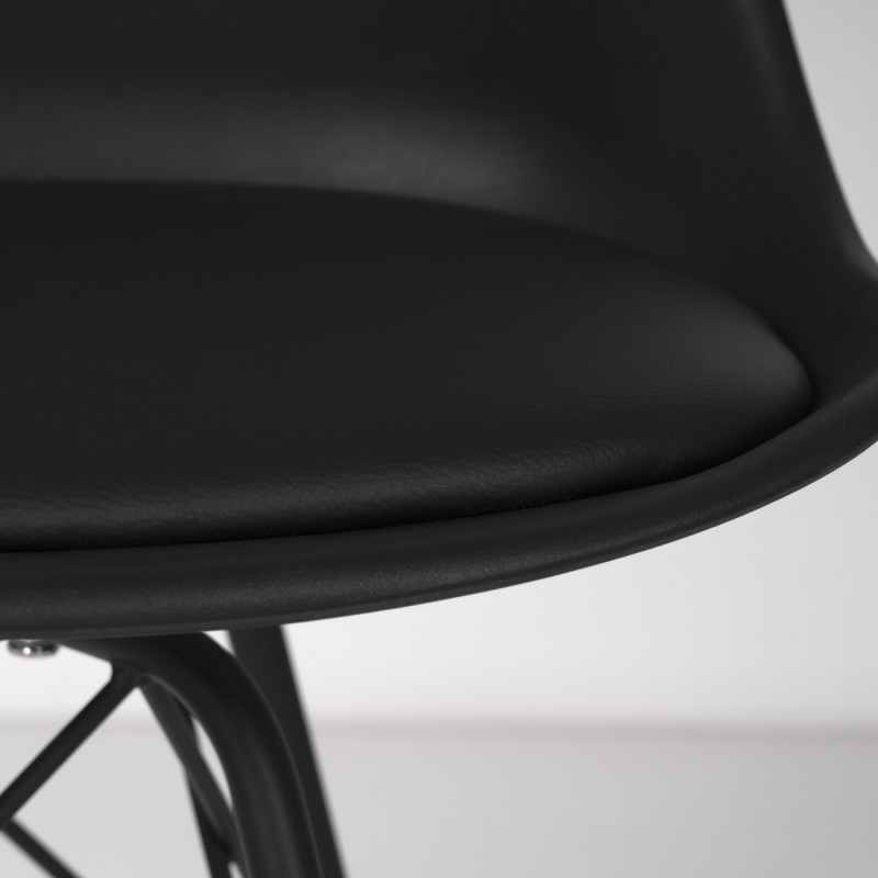 O encosto, fabricado em polipropileno com uma leve curvatura ergonômica, é projetado para favorecer uma postura confortável e natural. O assento, acolchoado com poliuretano, proporciona conforto extra, tornando-a perfeita para uso prolongado. As pernas de metal, com estrutura entrecruzada, não só adicionam estabilidade, mas também realçam o design minimalista da cadeira.