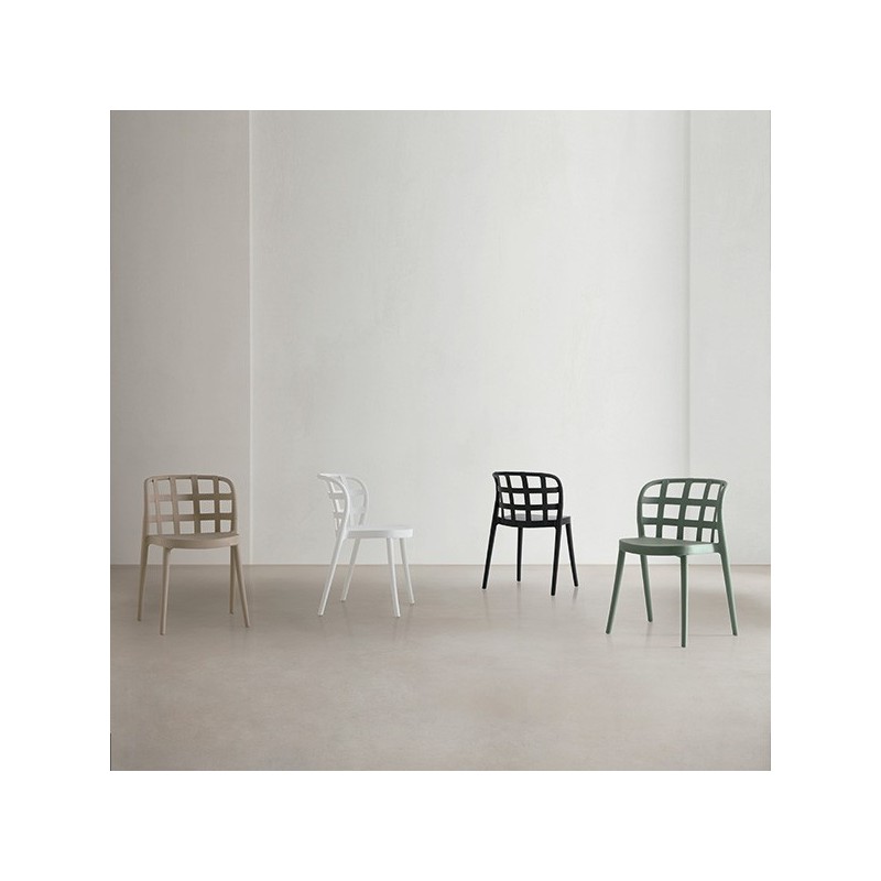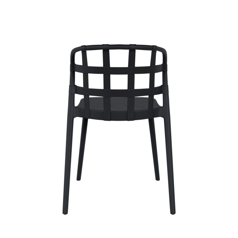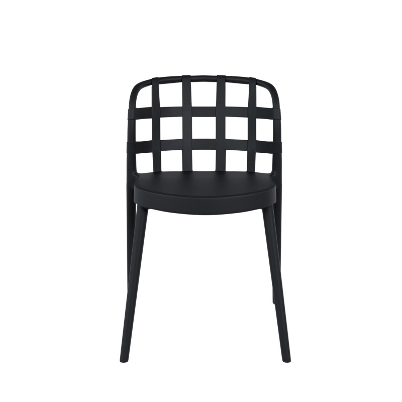 O assento, com espessura generosa, oferece maior conforto e estabilidade, enquanto o encosto, ligeiramente curvado, é projetado para se adaptar ergonomicamente à forma das costas, proporcionando uma experiência de assento mais confortável e relaxada. Este último, além disso, destaca-se por seu padrão distinto de grade com tiras largas entrelaçadas, trazendo um toque moderno e sofisticado. Fabricada completamente em polipropileno de alta qualidade, esta cadeira não é apenas durável, mas também empilhável, o que facilita seu armazenamento e transporte.