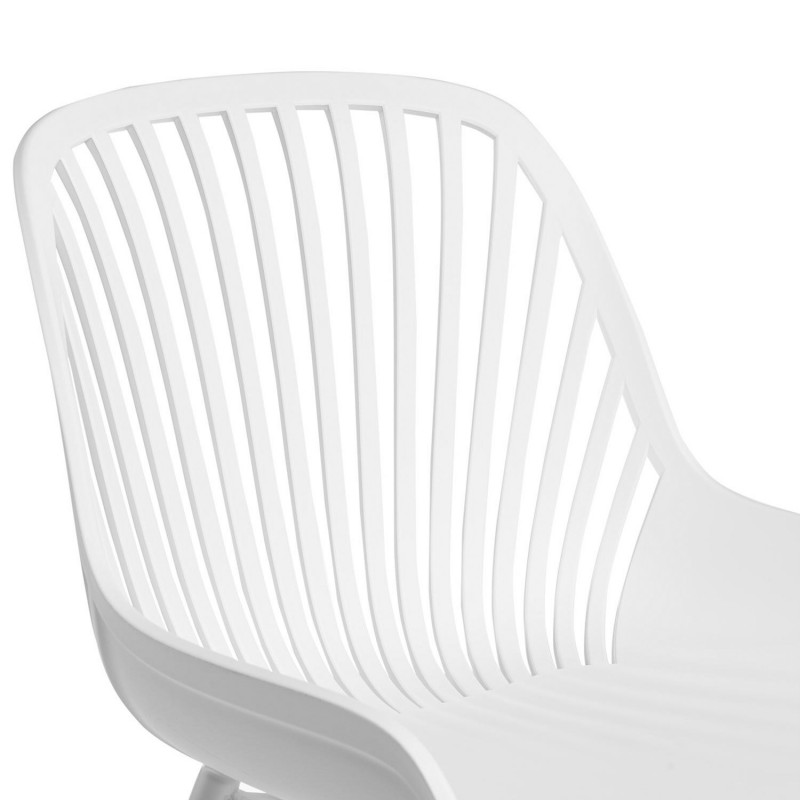 O encosto, composto por barras finas, adiciona um toque distintivo e moderno, enquanto as estilizadas pernas de metal reforçam seu aspecto sofisticado, fazendo desta cadeira uma escolha ideal para qualquer espaço contemporâneo.