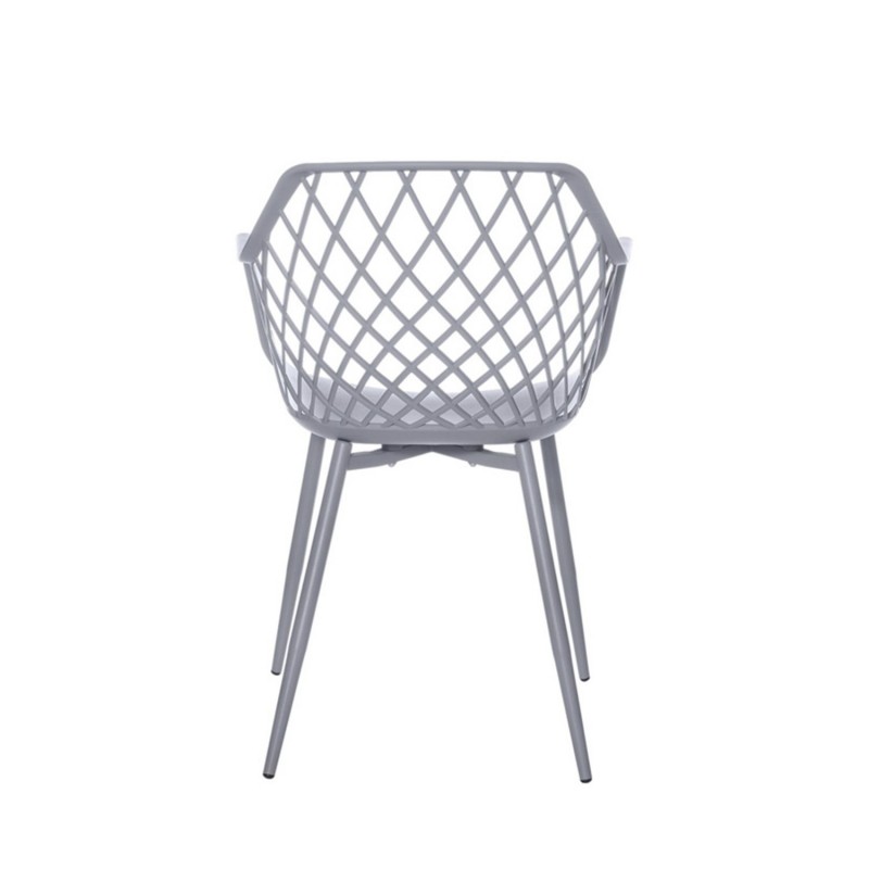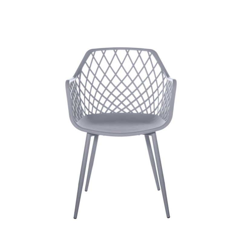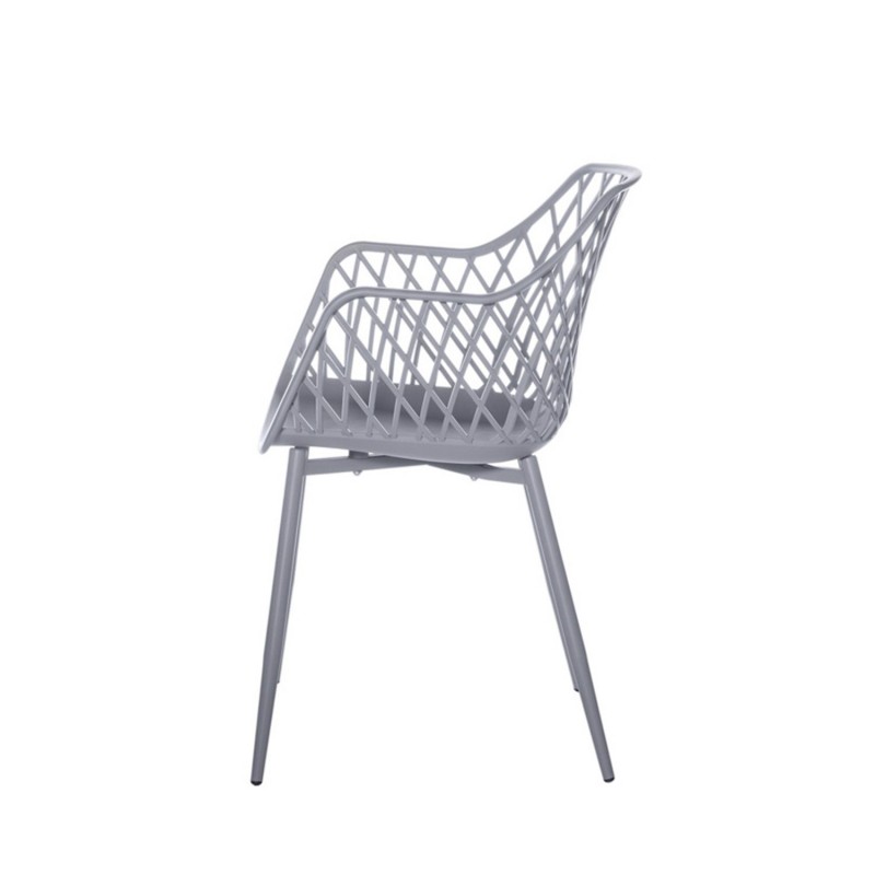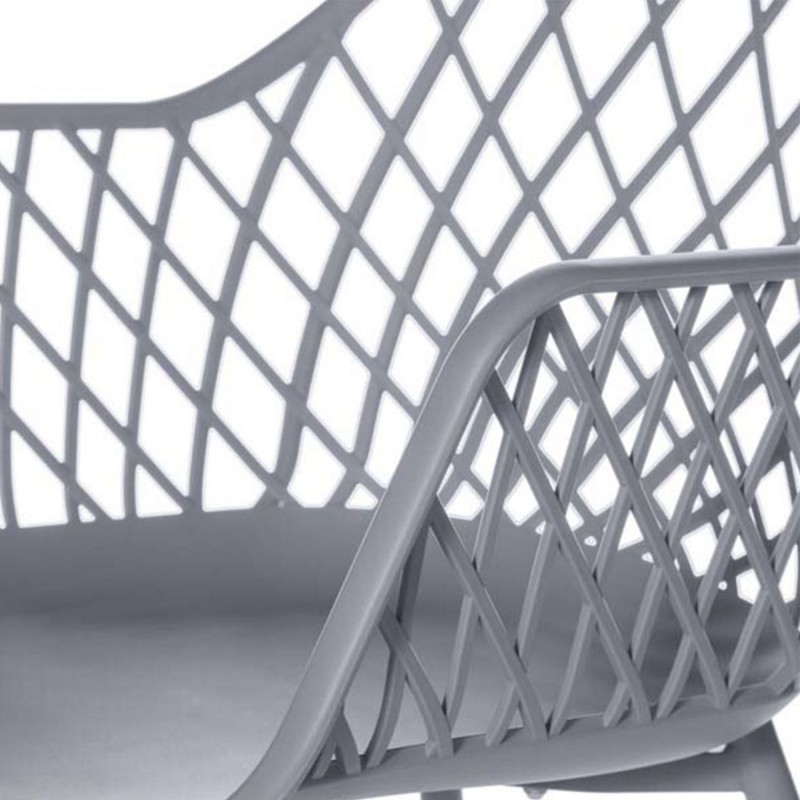 Seu encosto e braços entrelaçados em forma de grade criam um padrão geométrico que adiciona um toque distintivo a qualquer espaço. Fabricada com polipropileno resistente e pernas de metal laqueado, esta cadeira é ideal para aqueles que buscam uma peça atemporal e versátil.