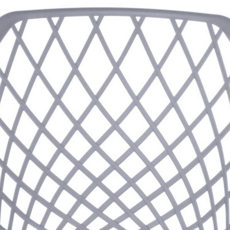 Seu encosto e braços entrelaçados em forma de treliça criam um padrão geométrico que adiciona um toque distintivo a qualquer espaço. Fabricada com polipropileno resistente e pernas de metal lacado, esta cadeira é ideal para aqueles que procuram uma peça atemporal e versátil.