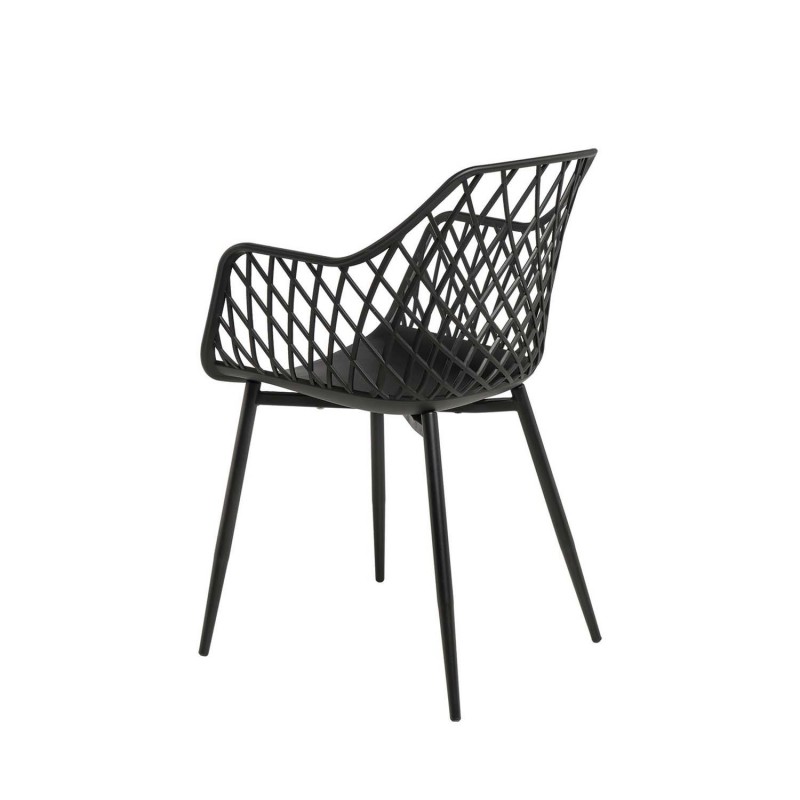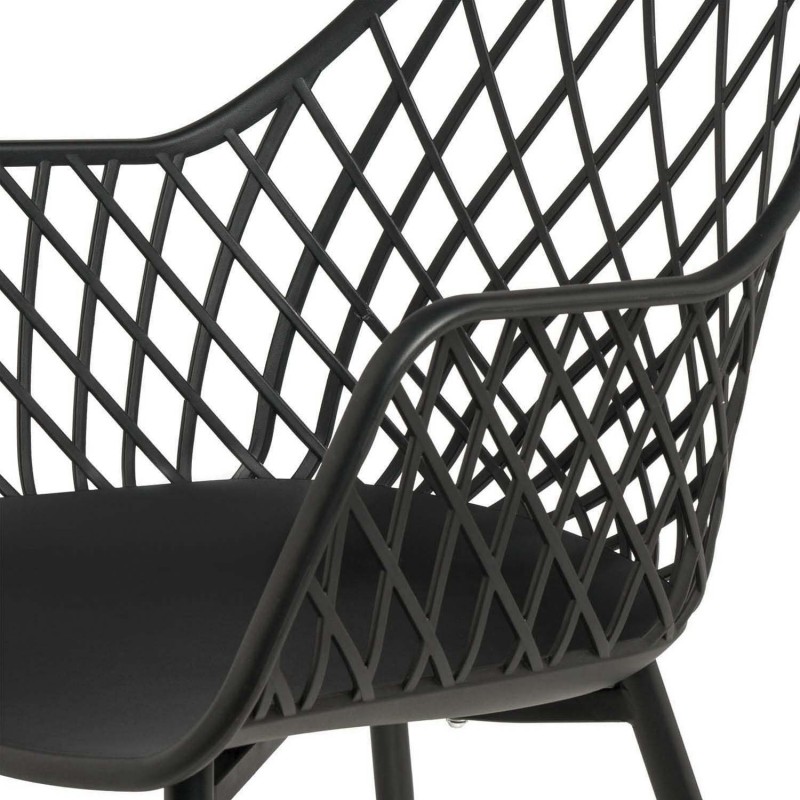 Seu encosto e braços entrelaçados em forma de grade criam um padrão geométrico que adiciona um toque distintivo a qualquer espaço. Fabricada com polipropileno resistente e pernas de metal lacado, esta cadeira é ideal para quem procura uma peça atemporal e versátil.