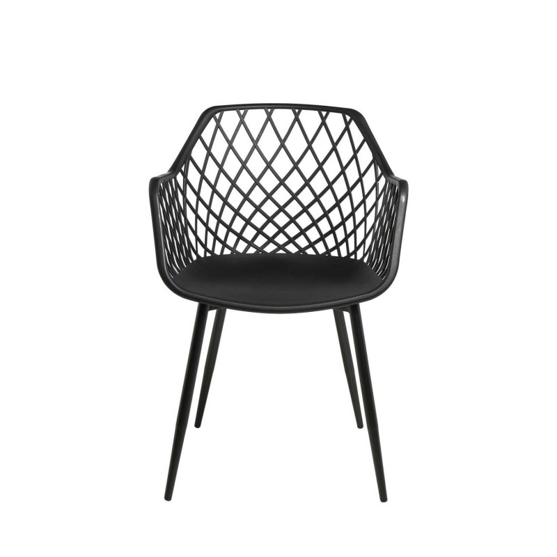 Seu encosto e braços entrelaçados em forma de grade criam um padrão geométrico que adiciona um toque distintivo a qualquer espaço. Fabricada com polipropileno resistente e pernas de metal lacado, esta cadeira é ideal para aqueles que buscam uma peça atemporal e versátil.
