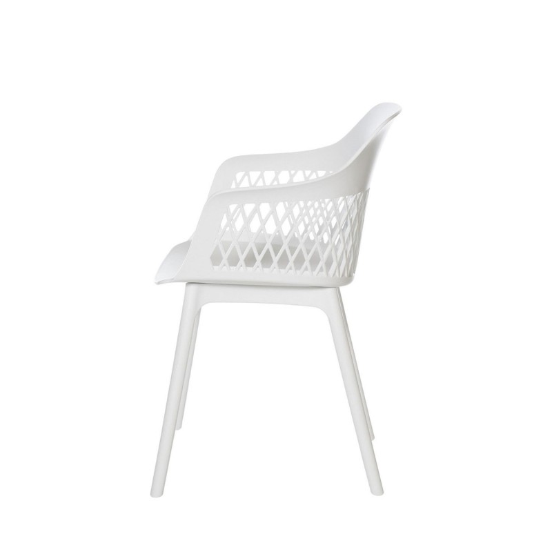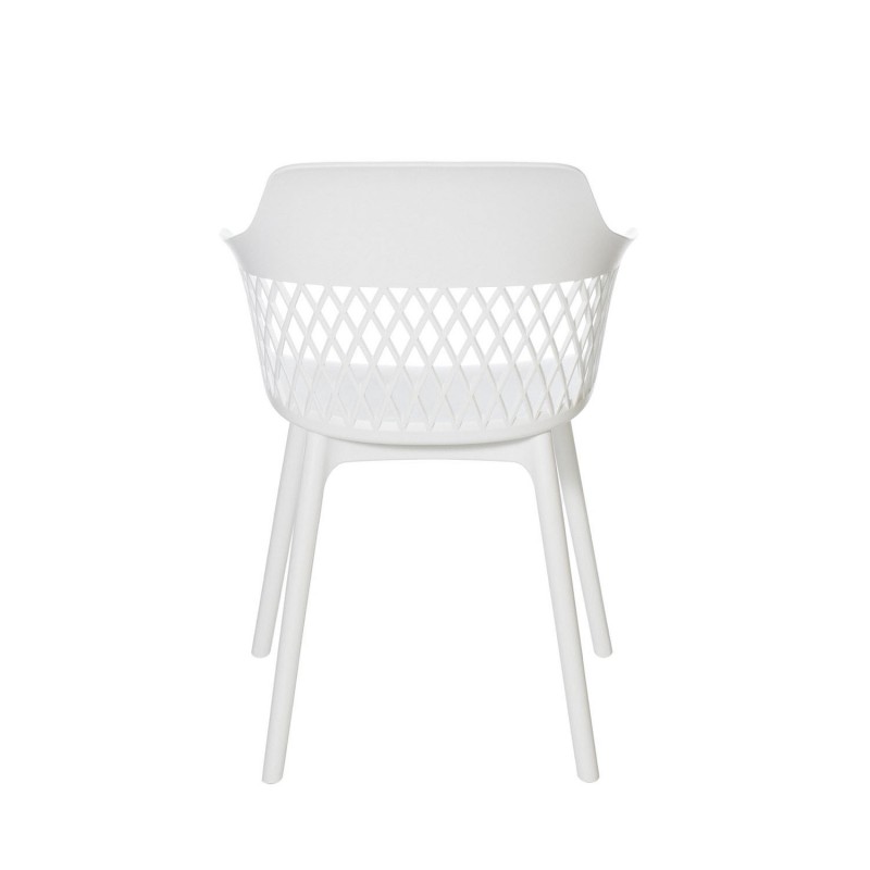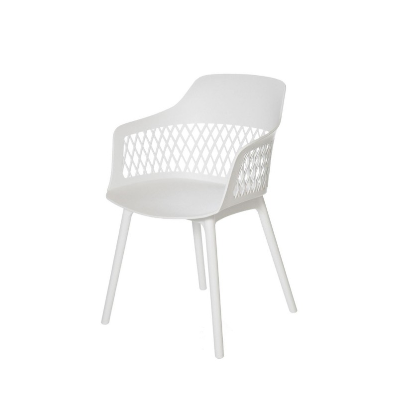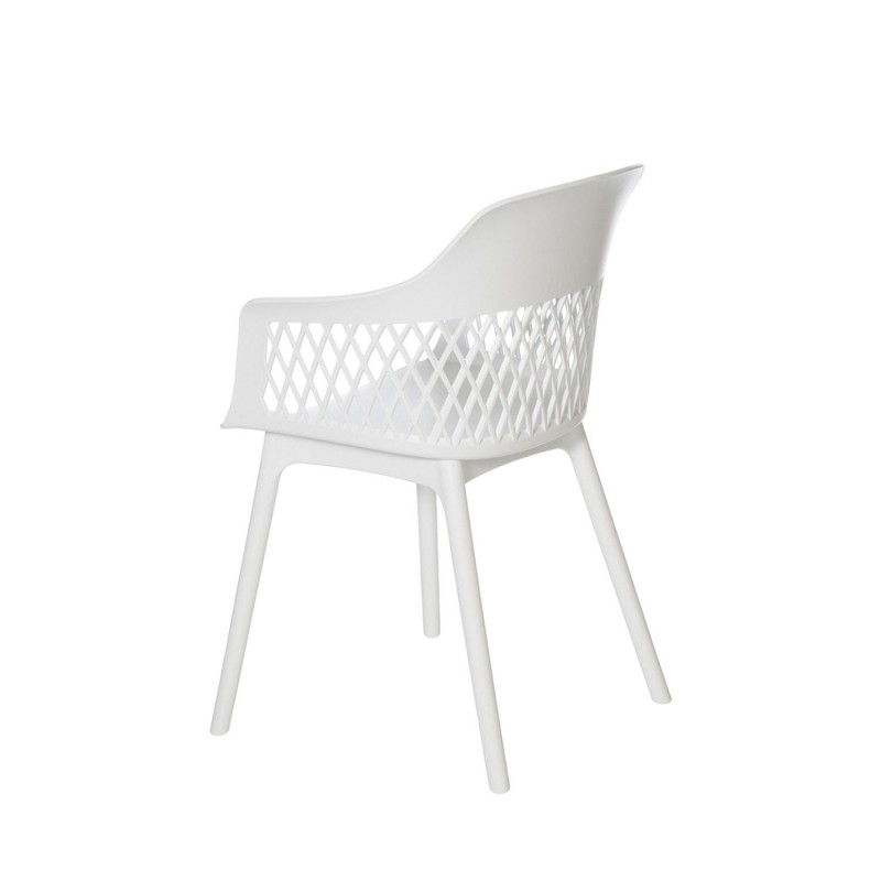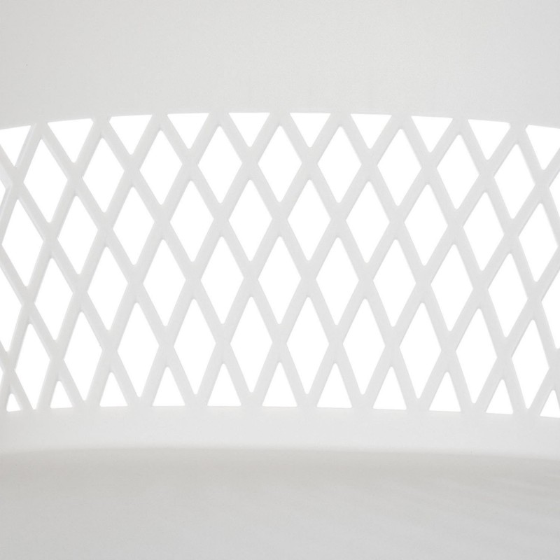 A cadeira JAYDEN na cor branca apresenta um encosto treliçado que lhe confere um aspecto leve e moderno. Seu design ligeiramente curvado proporciona um suporte ótimo para as costas, garantindo conforto e estilo em qualquer espaço.