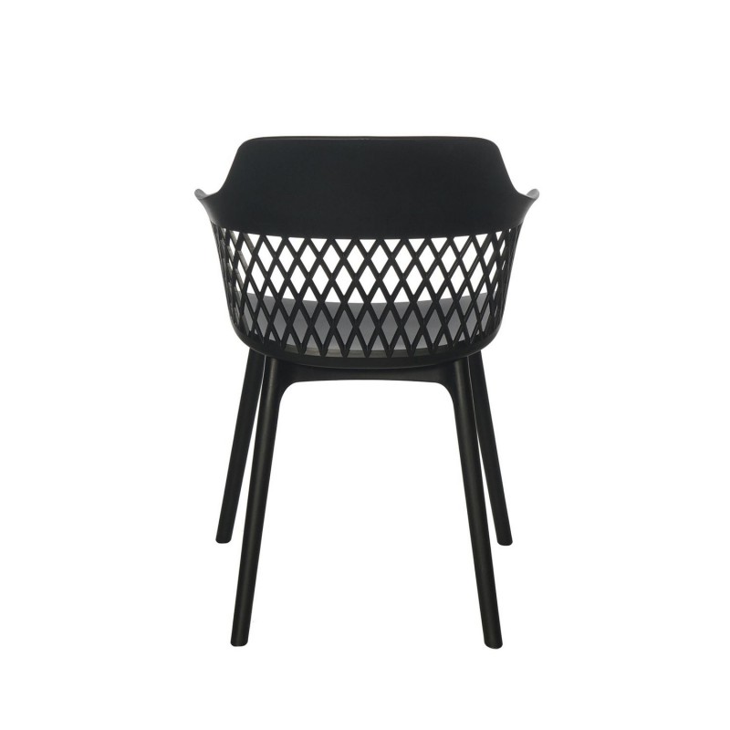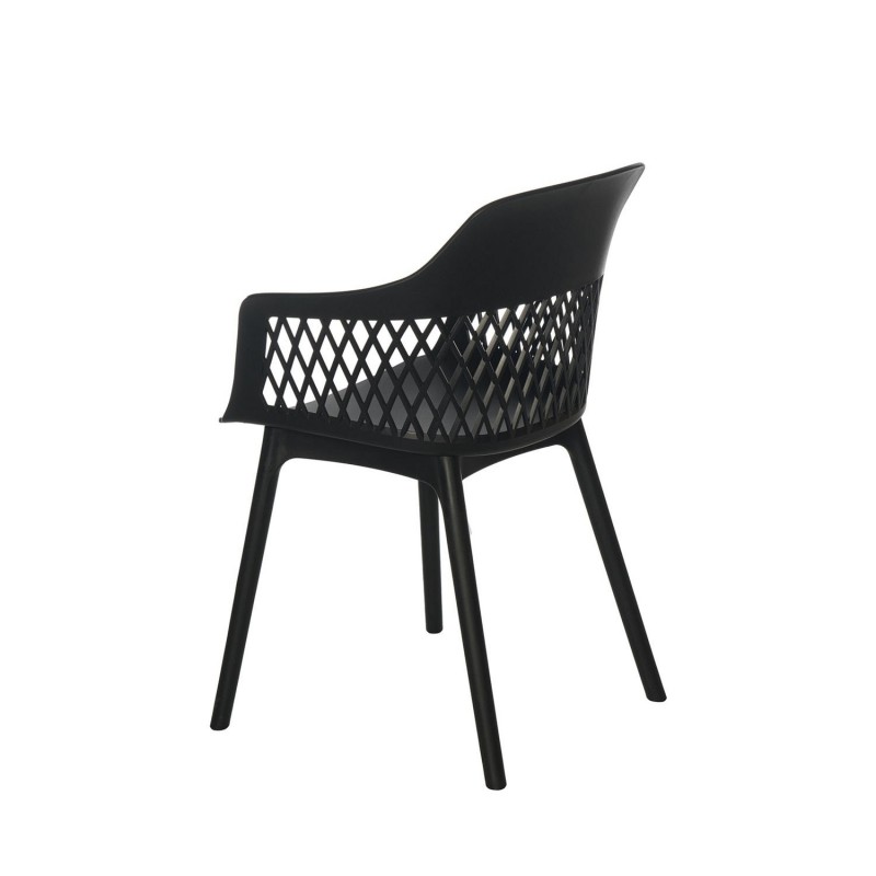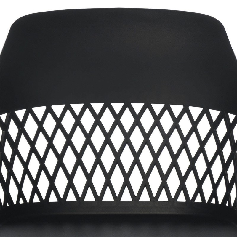 A cadeira JAYDEN na cor preta destaca-se pelo seu encosto em treliça que lhe confere um aspecto leve e moderno. Seu design levemente curvado oferece um suporte ideal para as costas, garantindo conforto.