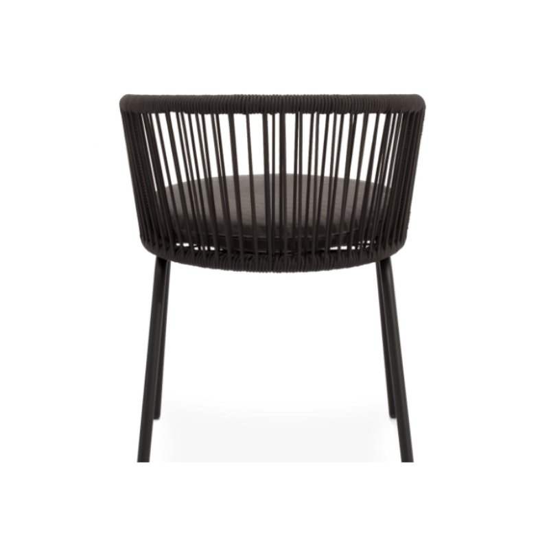 A cadeira VILMA para ambientes externos conta com um assento e encosto trançados em resistente corda, destacando suas linhas suaves e envolventes, além de sua cor cinza.
