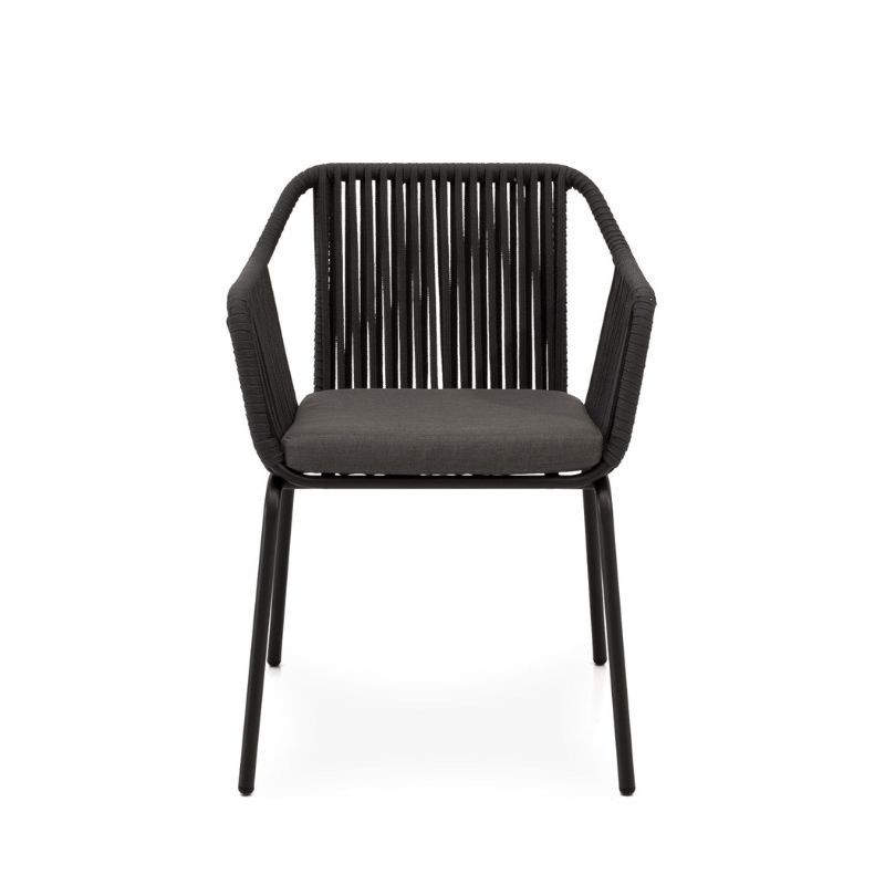 A cadeira de exterior PENNY cinza tem um encosto e braços com uma estrutura composta por linhas verticais de corda e, além disso, pernas de aço especialmente tratado para resistir às intempéries.