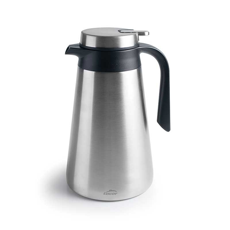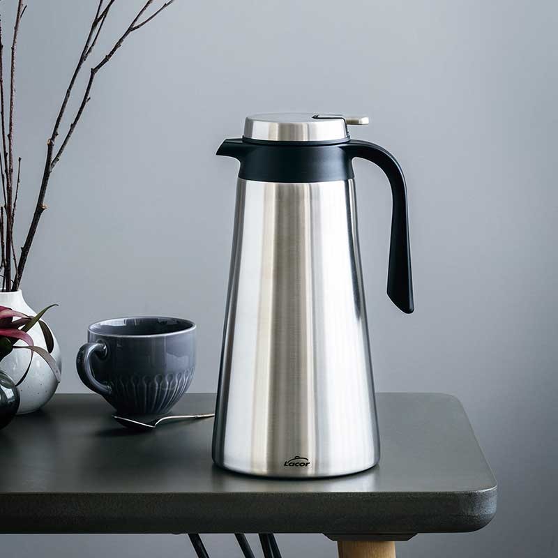 Jarra termo com interior e exterior em aço inoxidável que mantém os líquidos quente ou frios durante horas.