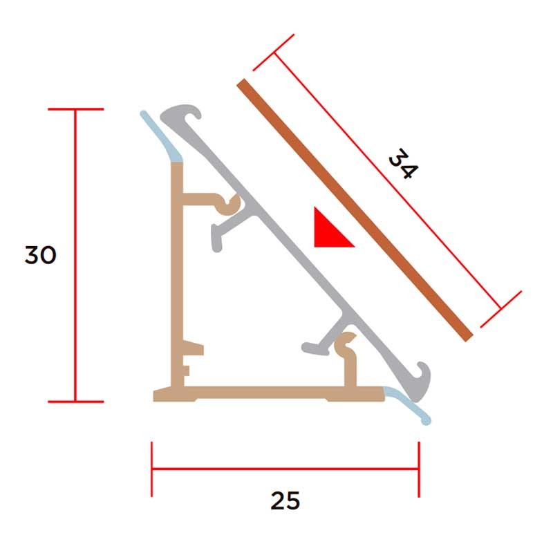 Topete isolante anti-respingo em ângulo de 45º para bancadas de cozinha pós-formadas feito em alumínio com frente apainelável com faixa decorativa.