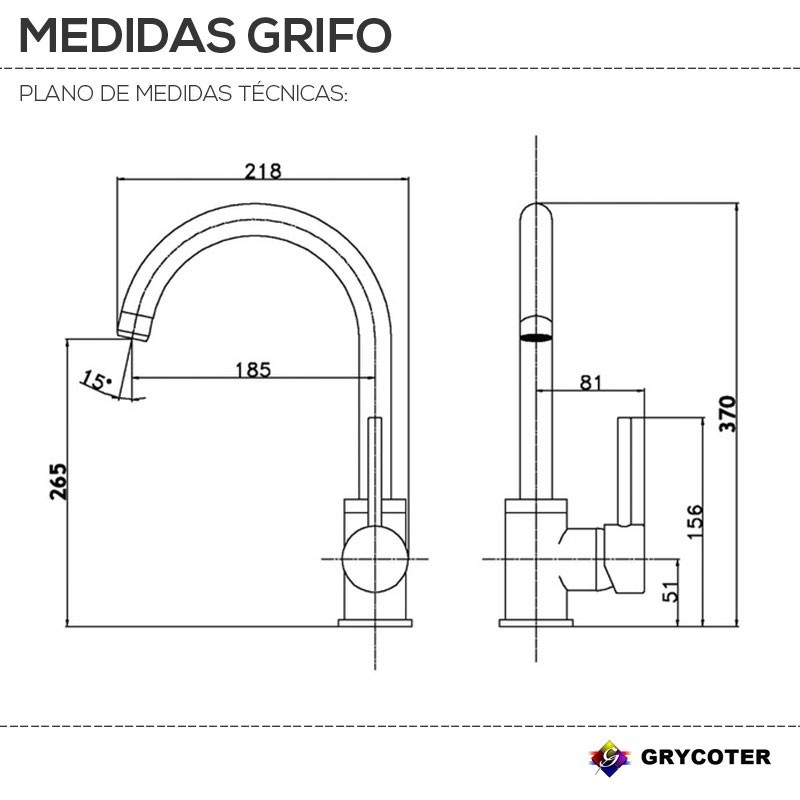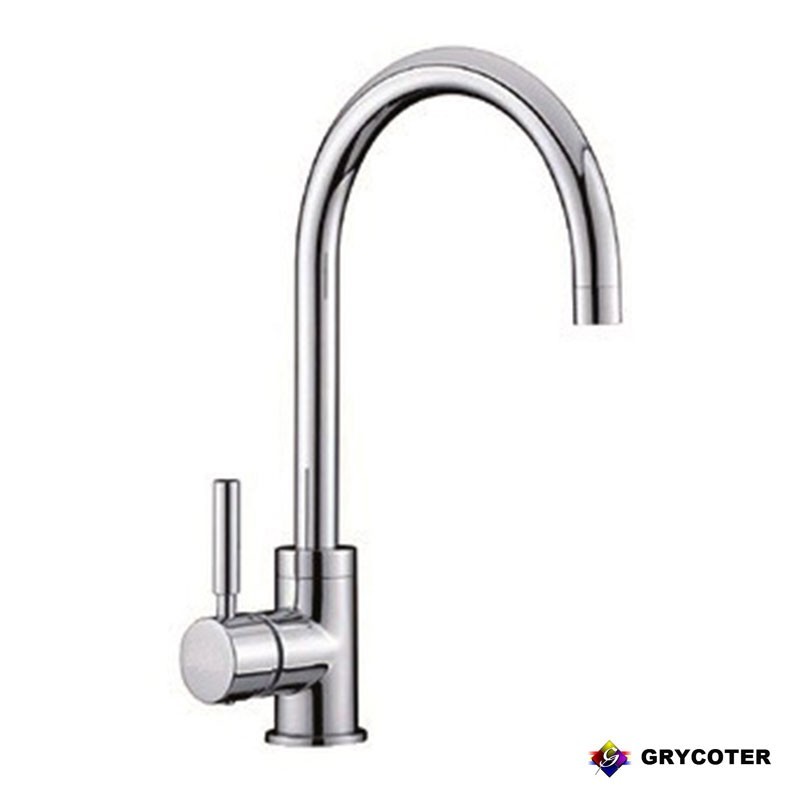 Torneira monocomando Grycoter GF124 para pia de cozinha com bica de tubo conformado vertical. Altura: 37 cm até a base. Fundo: 21,8 cm