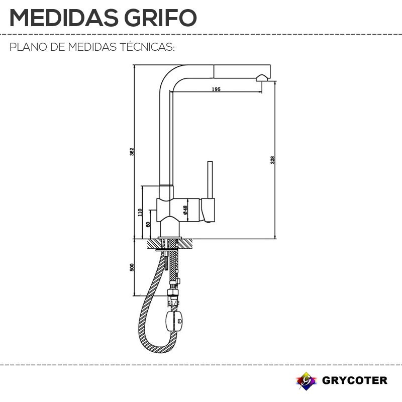 Torneira monocomando vertical Grycoter GF119 para pia de cozinha com chuveiro extraível. Altura: 36,2 cm até a base. Profundidade: 19,5 cm