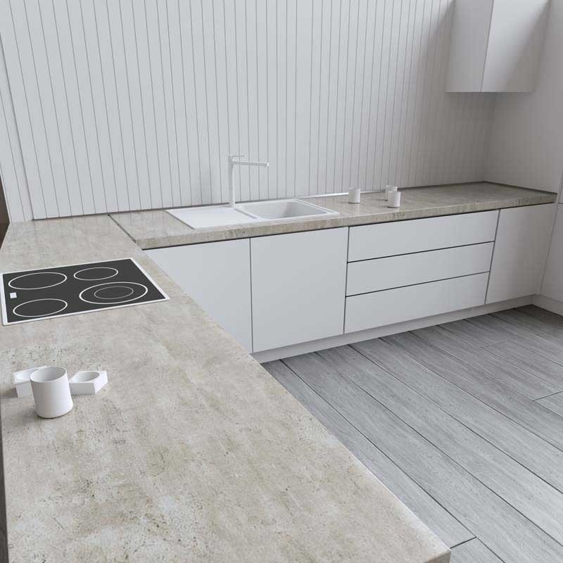 Topete apainelável para bancada de cozinha feito em alumínio com decoração frontal em acabamento Cimento Natural.
