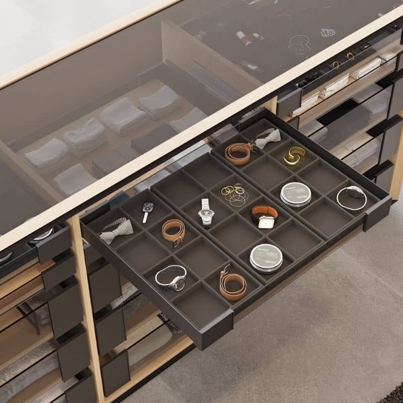 Bandeja ideal para guardar acessórios em gavetas de armários e closets. Disponível no acabamento antracite.
