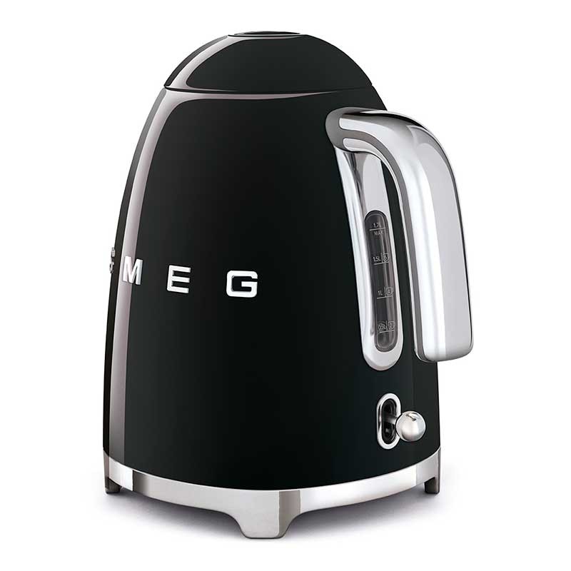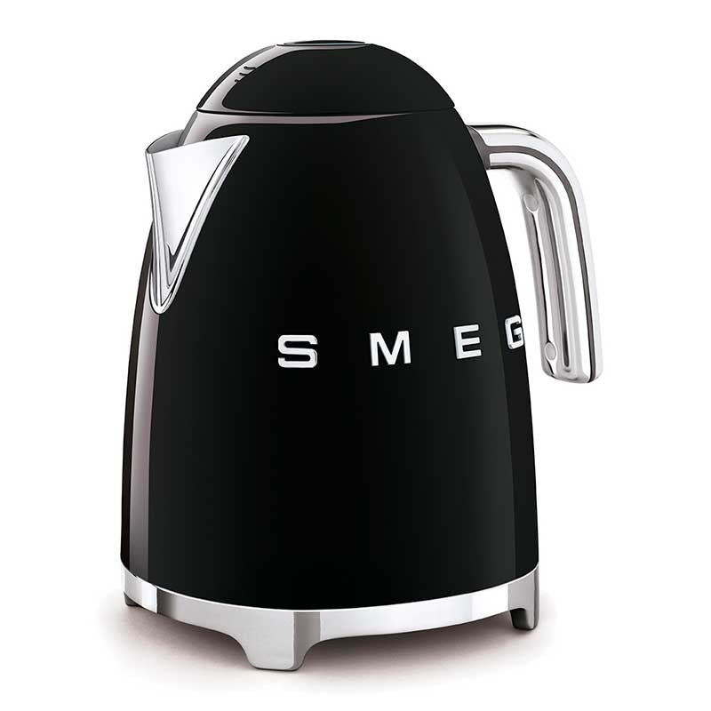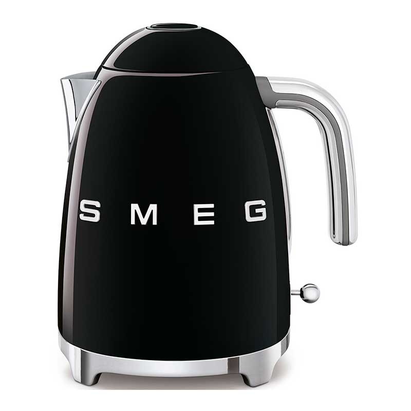 Chaleira padrão Smeg 50's Style de 1,7 litros de capacidade com corpo em aço inoxidável acabamento preto brilho e base giratória 360º.