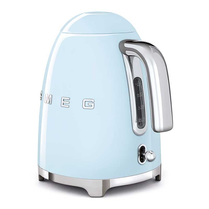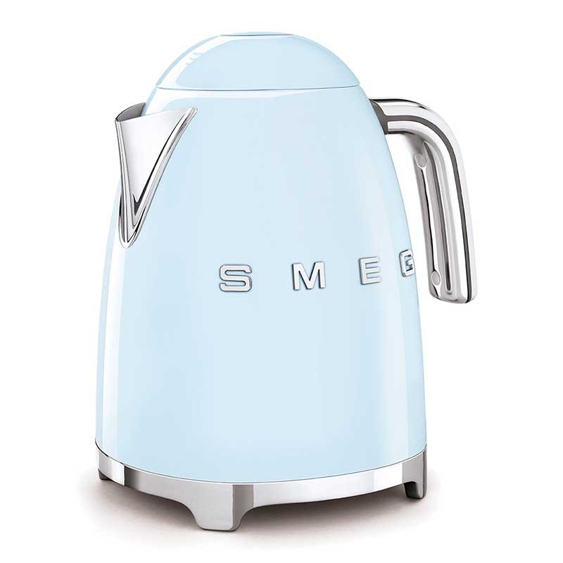 Chaleira padrão Smeg 50's Style de 1,7 litros de capacidade com corpo em aço inoxidável acabamento azul céu brilho e base giratória 360º.