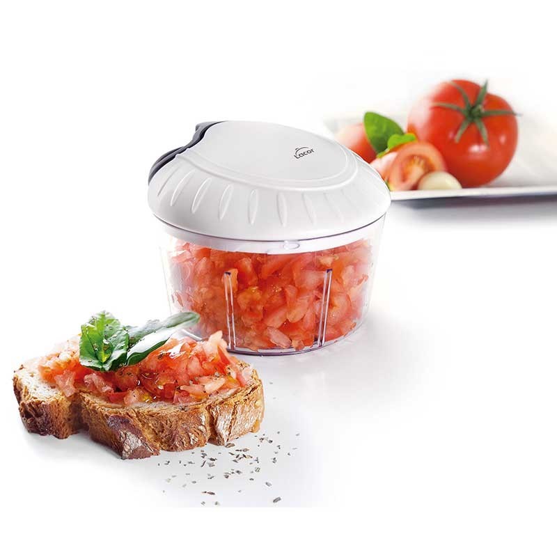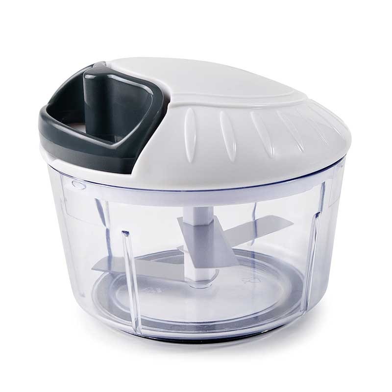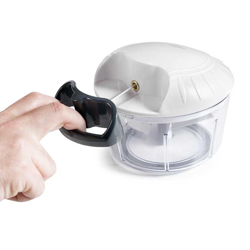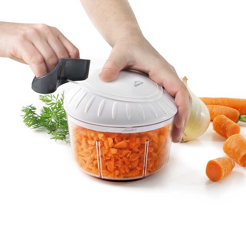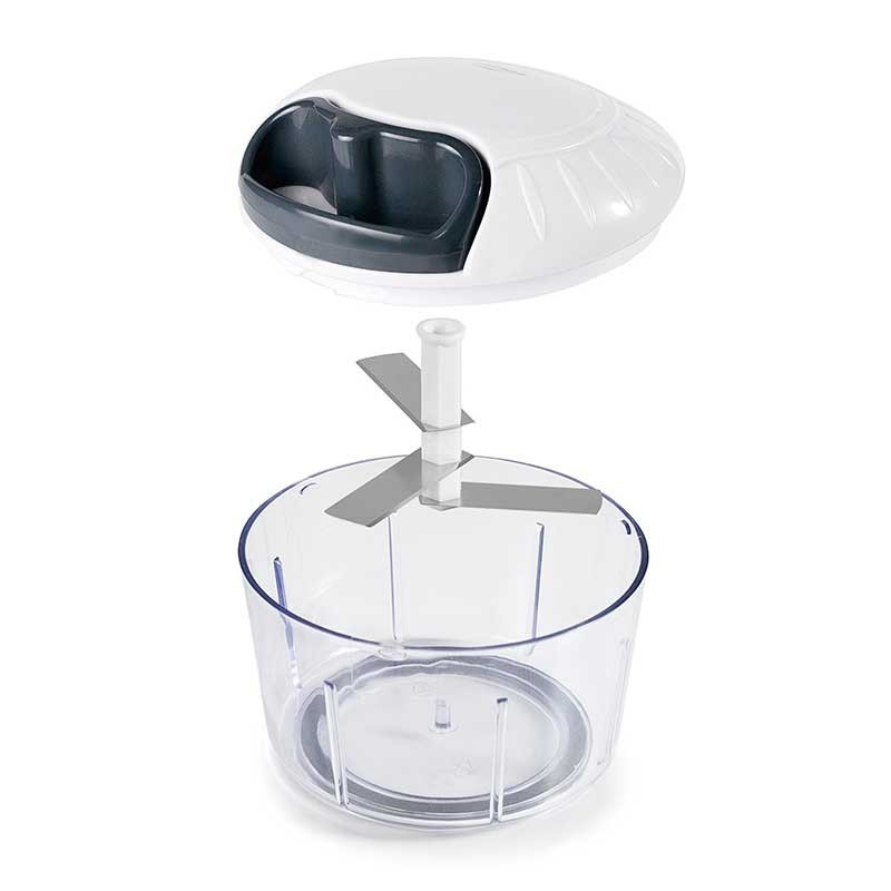 Triturador de mecanismo manual que pica e curta alimentos em segundos, graças às suas 3 poderosas lâminas ultra-resistentes de aço inoxidável. Ideal para triturar todos os tipos de alimentos, como vegetais, frutas, produtos hortícolas, como cebolas, beterrabas, alho, ervas, jemgibre, frutos secos, etc.