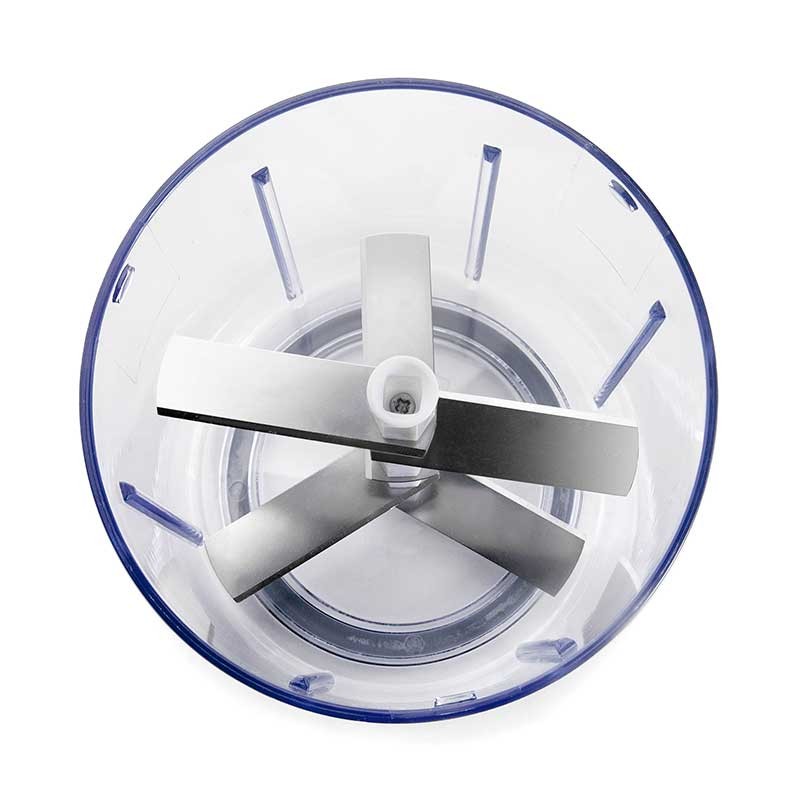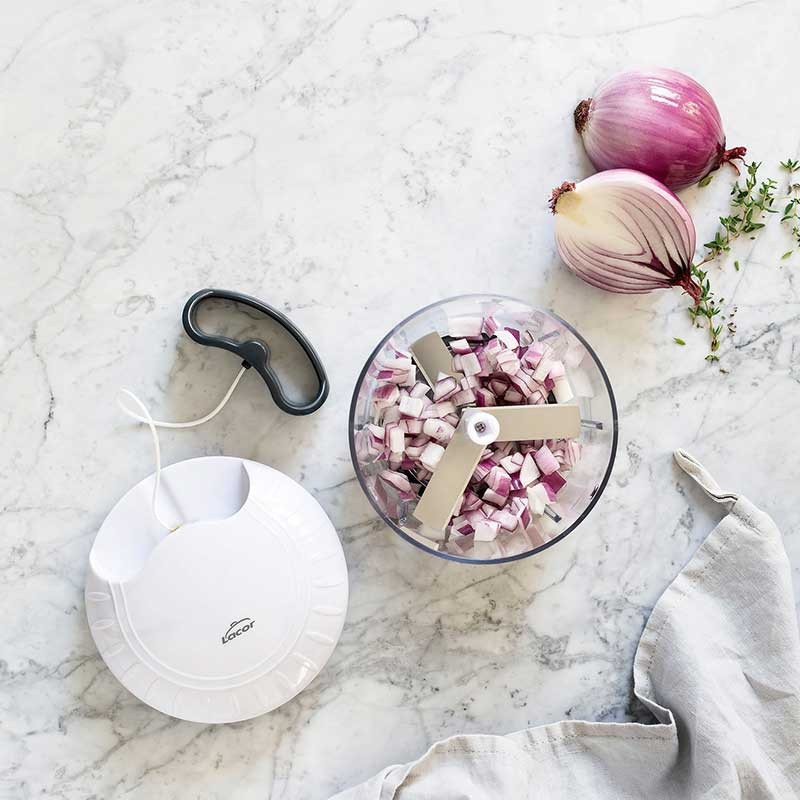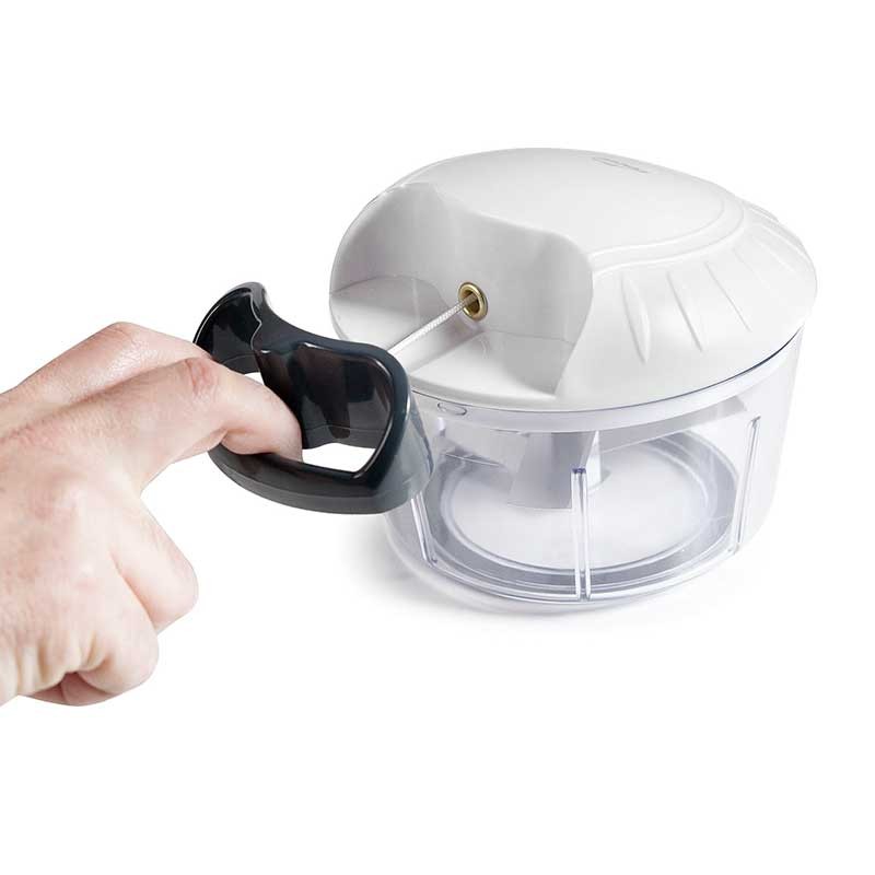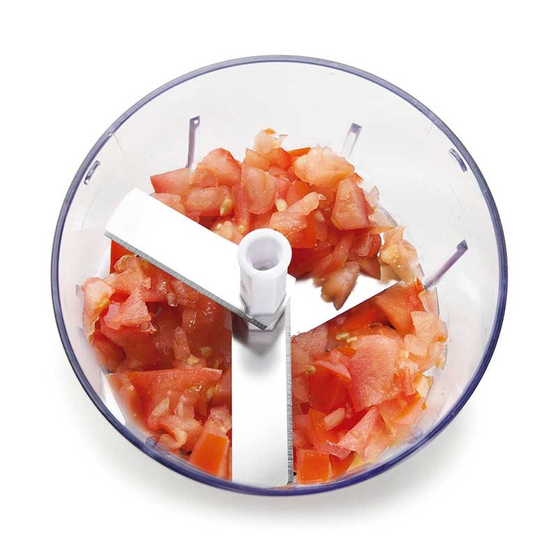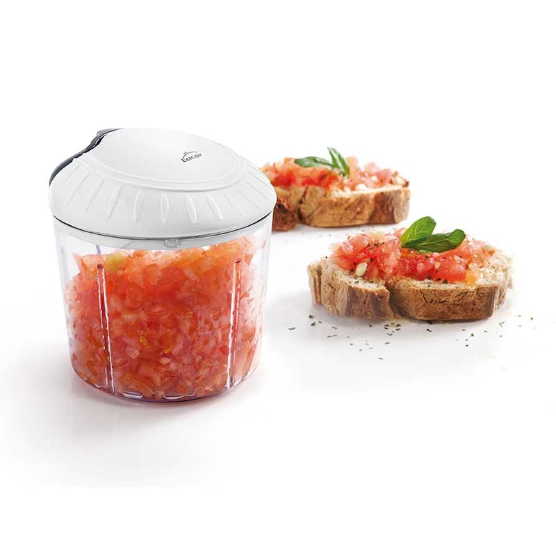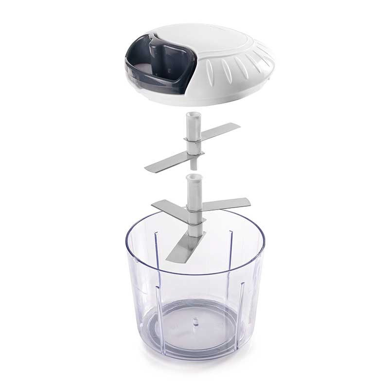 Triturador de mecanismo manual que pica e curta alimentos em segundos, graças aos seus 5 poderosas lâminas ultra-resistentes de aço inoxidável. Ideal para triturar todos os tipos de alimentos, como vegetais, frutas, produtos hortícolas, como cebolas, beterrabas, alho, ervas, especiarias, frutos secos, etc.
