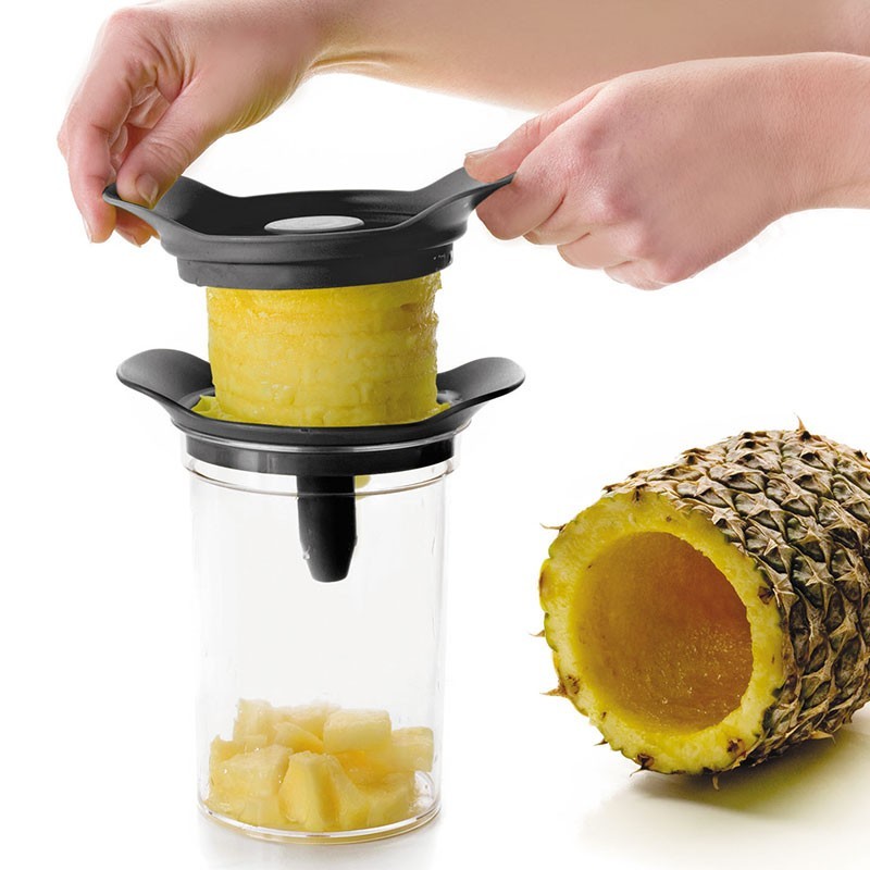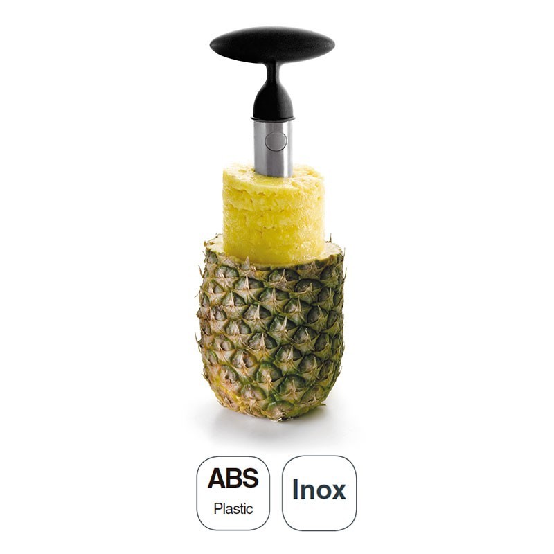Conjunto 3 em 1 fabricado em aço inox e ABS com um descascador de abacaxi, um cortador com recipiente e uma base empujadora ou para apresentação.