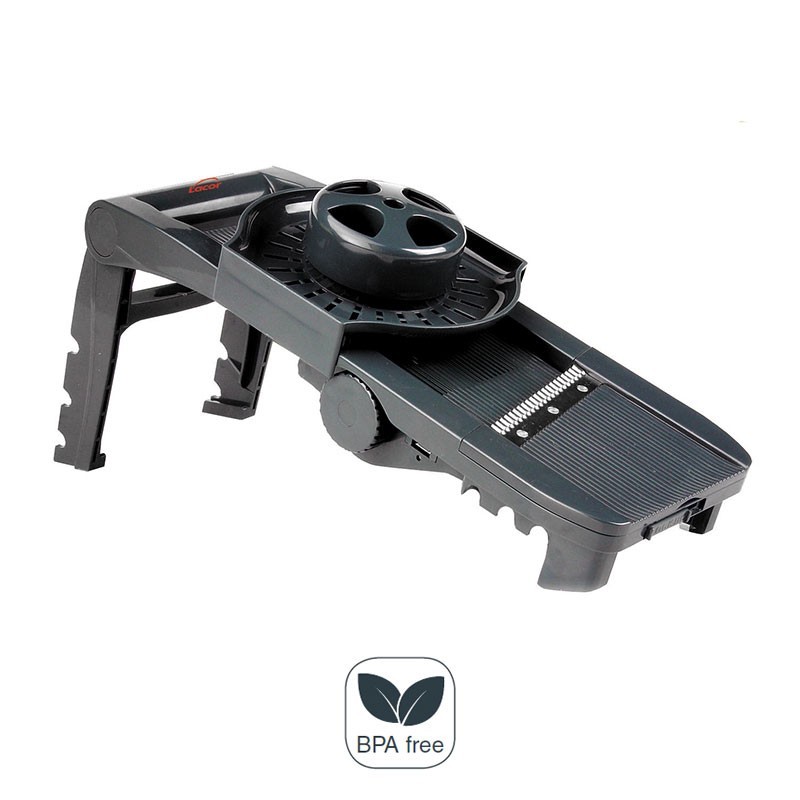 Bandolim com 5 lâminas intercambiáveis de aço inoxidável e um espremedor de sumos, fabricada em plástico PLÁSTICO de grande resistência. Medidas: 14,5x34,5 cm