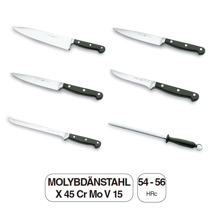 Tacoma de facas de cozinha 6 peças da série clássica, com lâmina forjada Molybdänstahl X 45 Cr Mo V 15 de dureza 54-56 HRc.