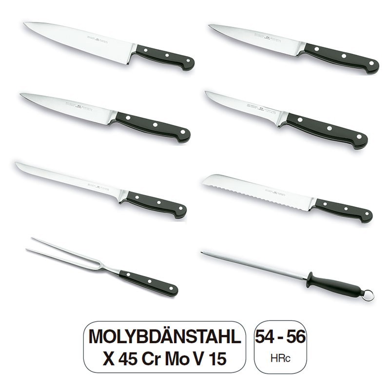 Tacoma de facas de cozinha 8 peças série Classic com lâmina forjada Molybdänstahl X 45 Cr Mo V 15 de dureza 54-56 HRc.