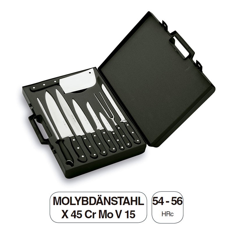 Mala de facas de cozinha semi-profissional 9 peças da série clássica, com lâmina forjada Molybdänstahl X 45 Cr Mo V 15 de dureza 54-56 HRc.