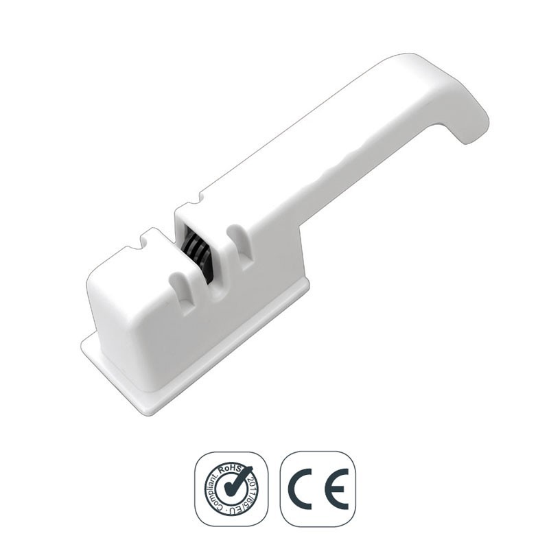 Afiador de facas manual com rulinas de aço. Basta deslocar a faca para a frente e para trás, para tirar a aresta de corte da lâmina da faca.